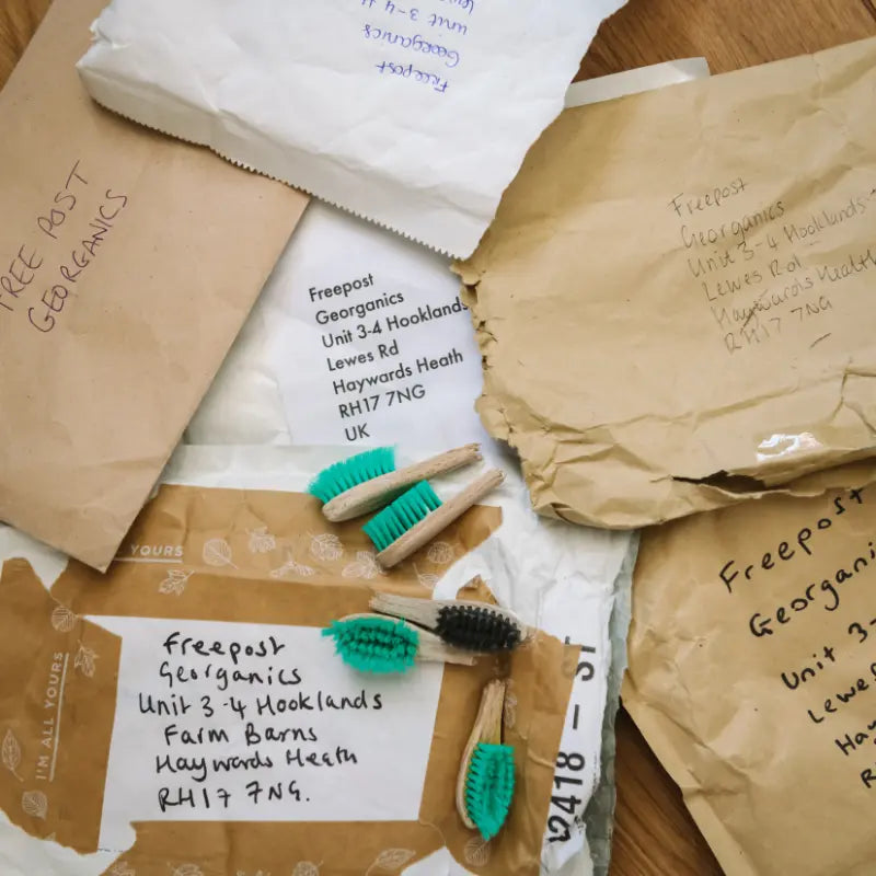Put everything into an envelope, a used one it's fine. On it, write Free-post Georganics Oral Care Ltd. This service is free (only in the UK), so make sure you don't get charged!